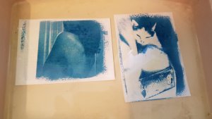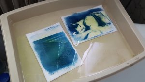 Jetzt mussten die Bilder nur noch in einer Wanne mit Wasser ausgewaschen werden. Beim Waschen werden nur die verbleibenden grĂŒn-gelben Bereiche ausgewaschen, die blauen Bereiche bleiben. Um das Papier nicht zu beschĂ€digen, sollte die Wanne beim Auswaschen leicht hin- und hergeneigt werden.