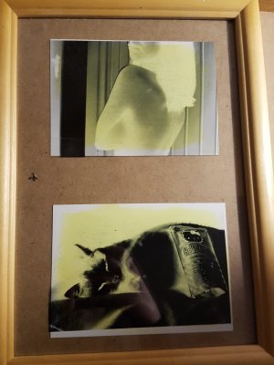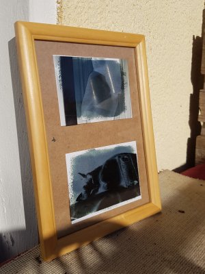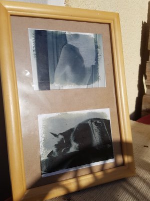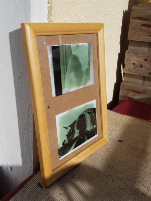 Die Folie haben wir dann in einen Bilderrahmen gelegt und die vorher vorbereiteten Papiere dahinter. Das ganze haben wir dann mit dem RĂŒcken des Bilderrahmens fixiert und dann ging es auf den Balkon, in die Sonne. Zum GlĂŒck war es wirklich sehr sonnig, sodass der Prozess sehr schnell vorran ging.